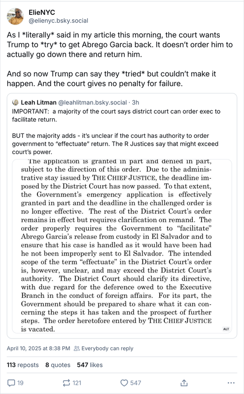 Elie Mystal and Leah Litman: the court wants Trump to *try* to get Abrego Garcia back. It doesn't order him to (Original Post) In It to Win It Apr 2025 OP