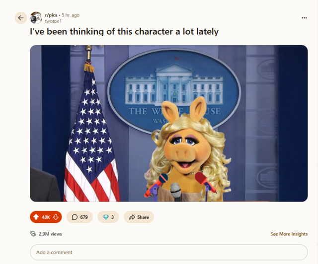 (7,085 posts)Her hate should be mocked! She's so repulsive as a person. Not Miss Piggy of course