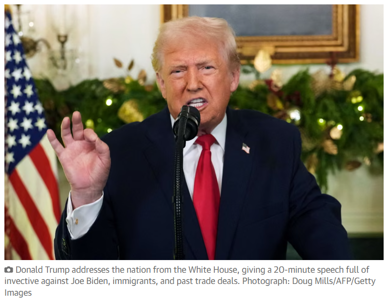 The US president sounded like a desperate man, pointing an accusing finger at Joe Biden and spreading the opposite of charity and cheer on issues such as immigration. So much for tis the season to be jolly. Like Biden, Trump has abandoned the traditional end-of-year presidential press conference. He preferred to give a much-hyped 20-minute speech. If he had been sitting in the Oval Office, he might have got sleepy; instead he stood in the diplomatic room and ranted with monotone anger.