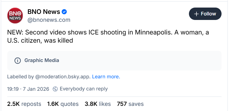 Bluesky is hiding our post which shows what happened in Minneapolis, even though there's no graphic content (the victim is never shown).