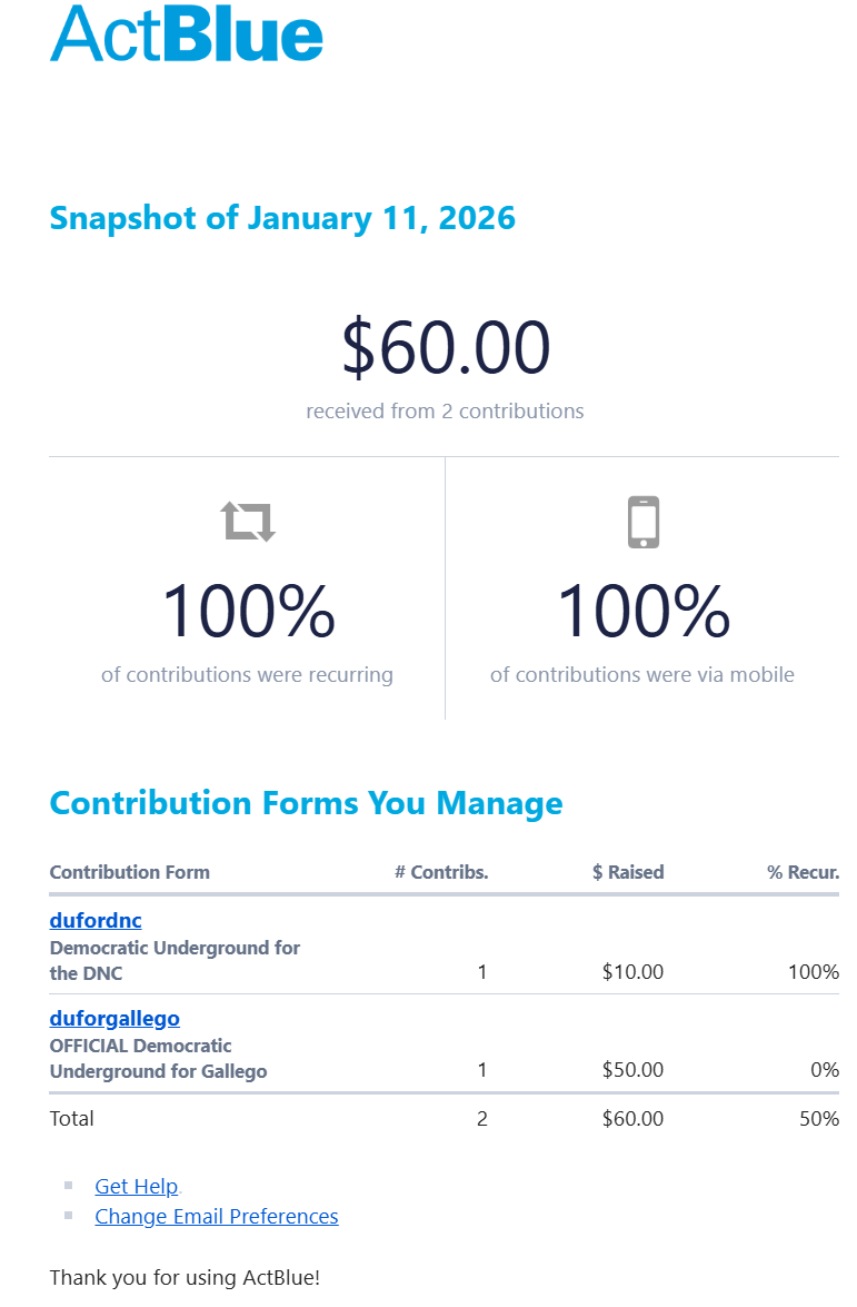 You raised $60.00 on January 11, 2026 @ ActBlue (Original Post) Omaha Steve Monday OP