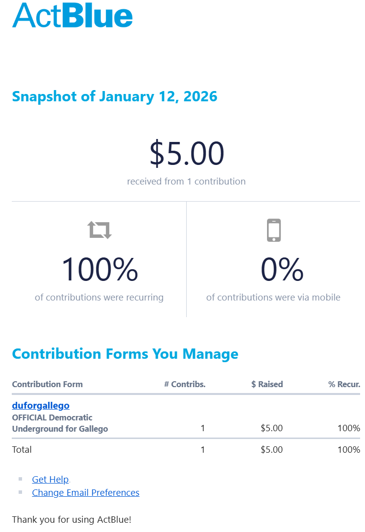 You raised $5.00 on January 12, 2026 @ ActBlue