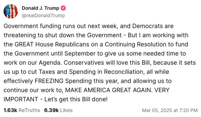 In a post on Truth Social, he framed the situation as though Democrats were the ones threatening to shut down the government, despite the fact that Republicans control both chambers of Congress. One would think Democrats would pounce on a CR for a Pelosi budget extension, but Trump has been impounding funds and obstructing those spending priorities with his DOGE initiatives overseen by Elon Musk.