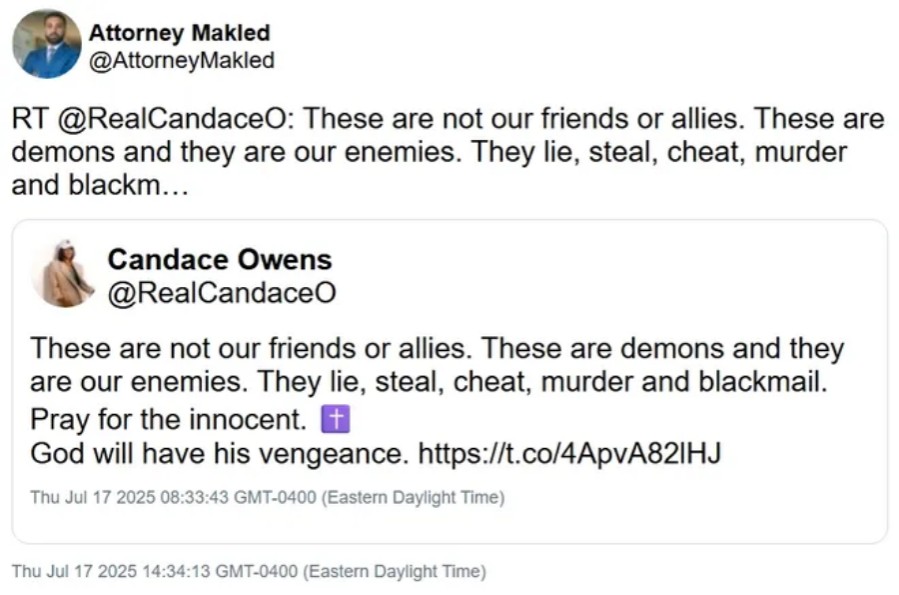 He also reposted the antisemitic posts from far-right influencers, including Candace Owens. The posts he shared from Owens from July 2025 included those where she called Israelis "demons" and said Israel is "demonic" and defined by "bloodlust."
