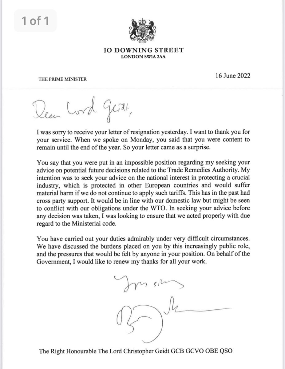 government says Geidt resignation just about potential breach of TWO tariff rules (probably steel)