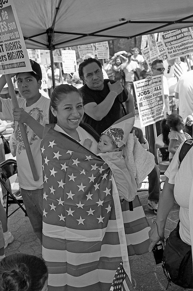 View of a demonstrator, with an American flag over her shoulders and carrying a baby, as she smiles during a A rally in support of immigrants rights in Union Square Park in New York City on May 1, 2010. The protests were a response to Arizonas law (Bill SB 1070), allowing law enforcement to check immigration status during stops, which critics feared would lead to racial profiling of Latinos and other communities. (Walter Leporati / Getty Images)