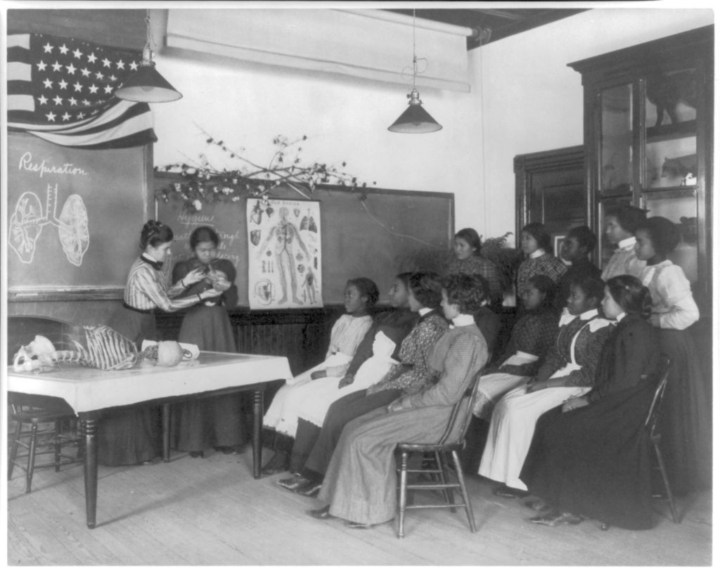 American Indian and African American students at Hampton Institute, in Hampton, Va., circa 1900. They women study the human respiratory system. Artist Frances Benjamin Johnston. (Heritage Art/Heritage Images via Getty Images)