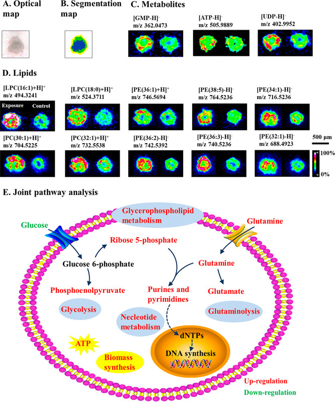Metabolomics can monitor the holistic changes of metabolites downstream of the genome and proteome, reflecting the physiological activities in cancer. (19,20) Three-dimensional cancer cell spheroid (CCS) is a precise in vitro cancer model for studying the carcinogenic mechanism of environmental pollutants as it closely mimics the complex spatial architecture, microenvironment, and physiological responses of solid tumor tissues. (21) There are proliferative (outer), quiescent (middle), and necrotic (inner) cells in CCS models due to the nutrient and oxygen concentration gradients, and they exert heterogeneity in exogenous stimulus responses, which highlights the importance of considering the various cell statuses in cancer research. Mass spectrometry imaging (MSI) is an innovative label-free technology that can simultaneously obtain chemical information and spatial distribution of diverse molecular species in different regions of CCS which has been used to identify and characterize the biological processes in cancer progression. (22,23) Integrated application of omics and MSI techniques in the CCS model can combine spatial information and in-depth analysis to better understand carcinogenic mechanisms of environmental pollutants... (24)