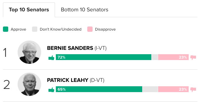 Sen. Bernie Sanders (I-Vt.) retained his spot atop the rankings after picking up 11 points from the previous quarter 72 percent of registered voters in the Green Mountain State approve of his job performance.