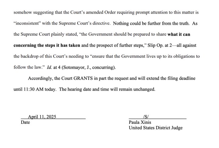 JUST IN: Judge Xinis *grants* the government a partial extension ... to 11:30 AM.