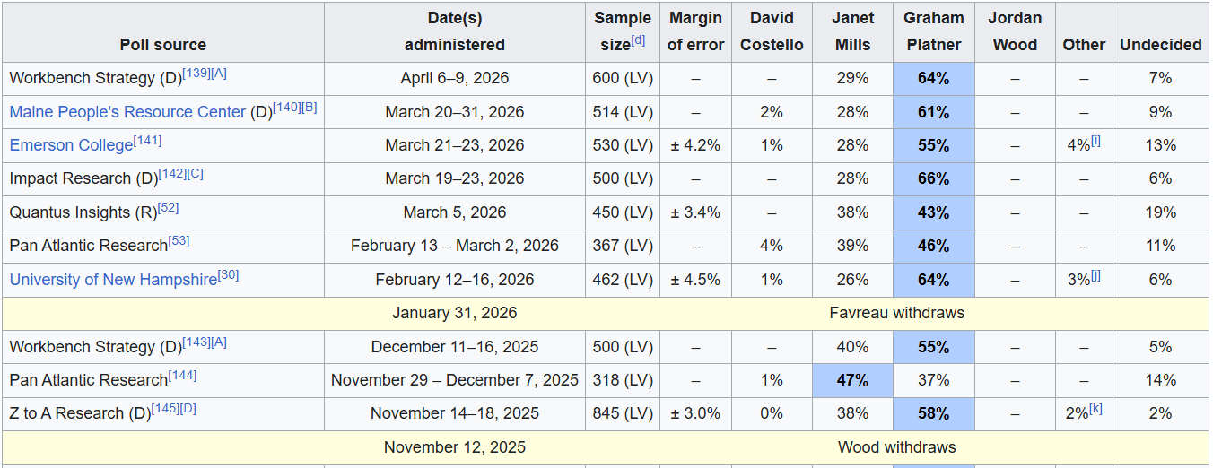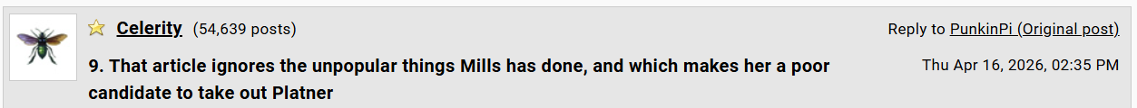 If a person is anti-Platner (and that is a valid stance IMHO, given his baggage), then I would think they must be very unhappy with Mills being their only other main choice (and Schumer and Gillibrand helping to make sure she was and is the only other main option, as they pushed hard to recruit her and only her).