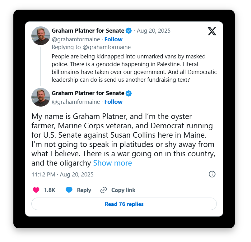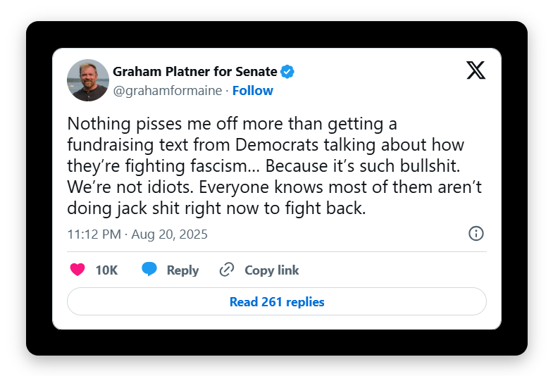 In reply to the discussion: Platner is fundraising by dissing Democrats [View all]Celerity