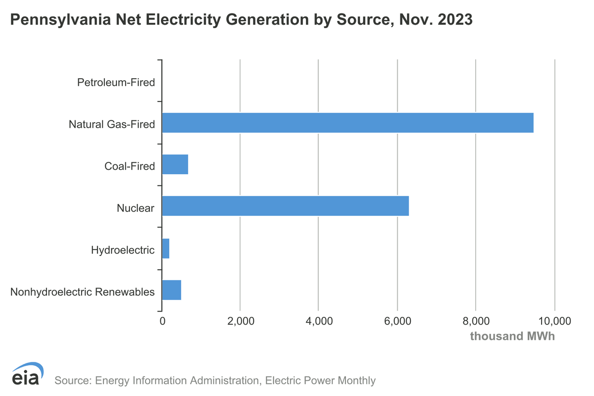 Pennsylvania has a relatively large number of nuclear plants, which have for years supplied a significant amount of their electicity. Their primary source of electricity is natural gas.